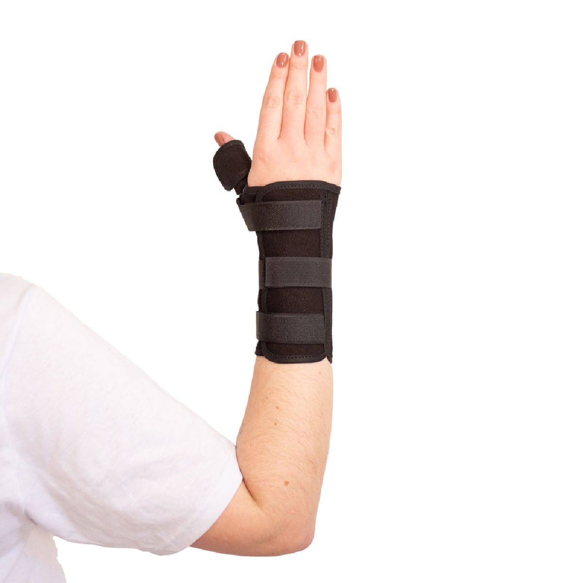 - Órtese curta com tala para punho e polegar, leve e confortável