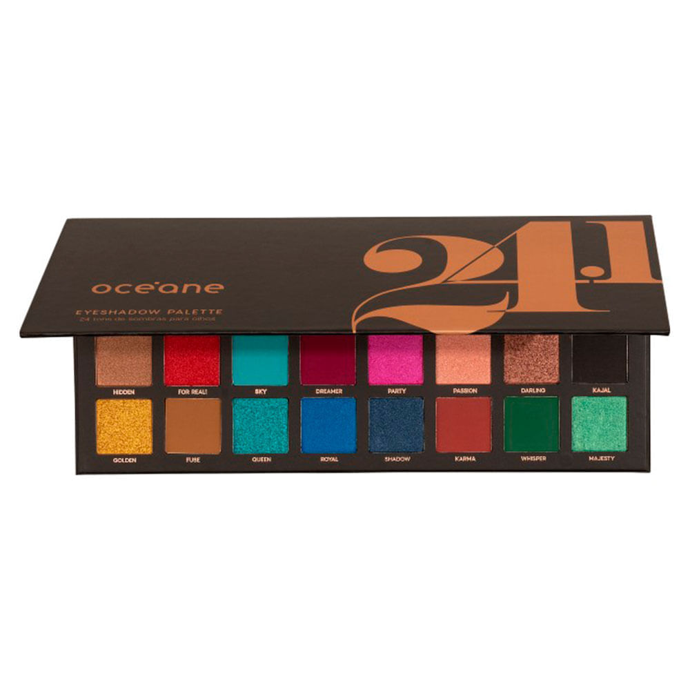 Paleta de Sombras 24.1 Cores Eyeshadow Palette Imagine encontrar, em uma única paleta, todas as cores que você mais ama? E, melhor ainda: encontrar em duas paletas uma variedade enorme de tons. Após o sucesso da 24 Eyeshadow Palette, a Océane apresenta a segunda versão da paleta, agora com as tendências de cores de 2021/22.A paleta apresenta as cores que são tendência, mas também podemos dizer que seguirão atemporais. Isso porque a marca cuidou para selecionar uma combinação que caiba em todas as ocasiões de uso e tons de pele. A paleta 24.1 apresenta onze cores opacas e treze cintilantes, todas com muita pigmentação e aquela fixação garantida por horas. Entre os clássicos preto e marrom, passando por tons como dourado e amarelo, as cores também trazem um toque de tendência como azul e vermelho.Do básico ao fashion, são 24 cores que deixarão qualquer look de arrasar.Tudo isso, pensado para compor diversos visuais. A proposta da paleta é que todas as cores formem grupos que conversem entre si, possibilitando à quem usá-la, brincar com as combinações sem medo de errar. Com tanta facilidade, o produto torna-se prático para ser utilizado em qualquer ocasião.Benefícios:• Alta pigmentação e fixação• 11 cores opacas• 13 cores cintilantes• Alta fixaçãoComo usar:Aplique com o auxílio de um pincel ou esponja nas regiões que desejar.Cuidados:Em caso de irritabilidade suspenda o uso e procure auxílio médico. Manter o produto fechado em temperatura ambiente. Uso externo. Mantenha fora do alcance de crianças.Sobre a Marca:A marca brasileira Océane foi criada para realçar o estilo da mulher conectada e de atitude, apaixonada por tudo relacionado à beleza e moda. Os produtos da marca trazem praticidade, alta tecnologia e fórmulas poderosas para facilitar o dia a dia da mulher moderna. A Océane acredita que toda mulher tem o poder transformador e a força de ser a protagonista de sua vida, para descobrir seu próprio encanto. Por isso desenvolve maquiagens, esmaltes e acessórios que valorizam a beleza e despertam a autoestima de seu público.