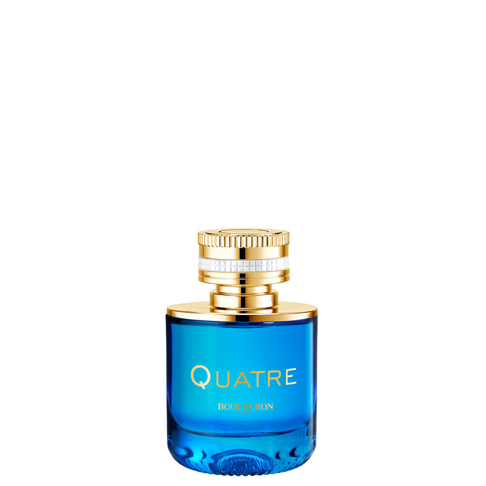 O produto é o Quatre Em Bleu Boucheron EDP, uma fragrância feminina floral amadeirada almiscarada inspirada na idealista de coração, na sonhadora curiosa que adora viajar pelo mundo.