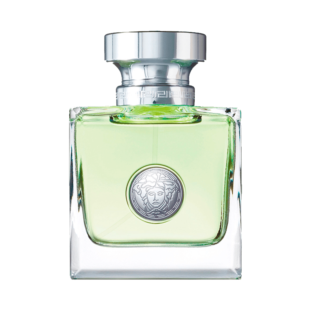 - Design ou Praticidade: Frasco elegante de 50ml em vidro transparente esverdeado com detalhes prateados e o símbolo da Medusa, assinatura da Versace.
