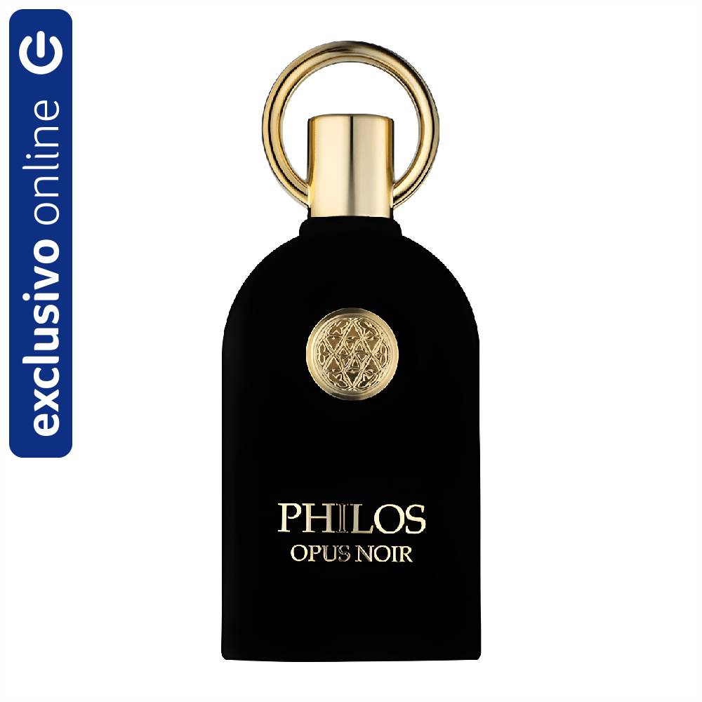 O produto em questão é o Maison Alhambra Philos Opus Noir Eau de Parfum, um perfume unissex em uma embalagem de 100ml.
