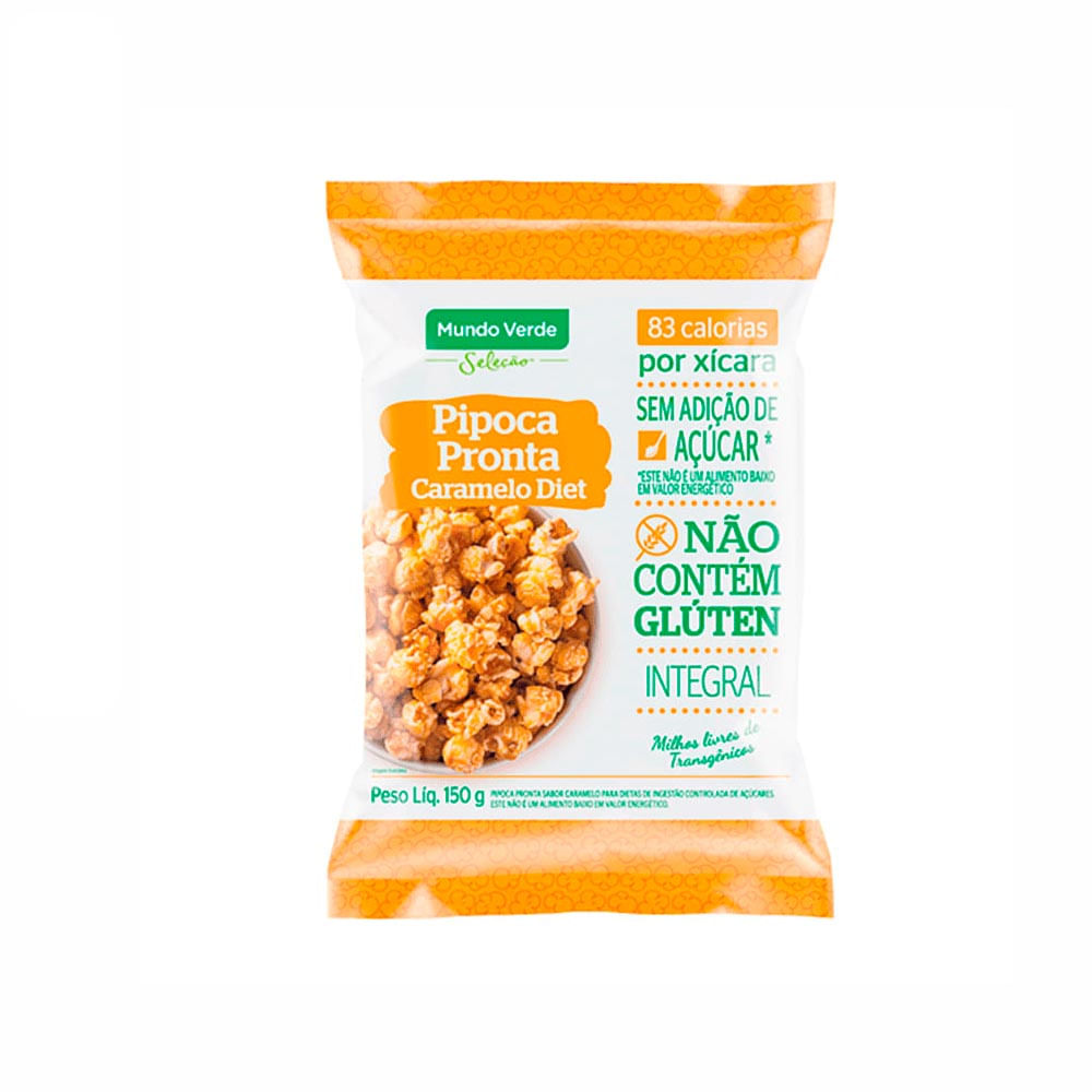 A Pipoca Pronta sabor Caramelo Diet Mundo Verde Seleção é produzida com milho livre de transgênico, estouradas no ar quente e com até 100 calorias por xícara. É feita com um milho do tipo mushroom que deixa a pipoca redonda. Livre de lactose e glúten. Sem adição de açúcar, é adoçada com edulcorante natural: stévia.