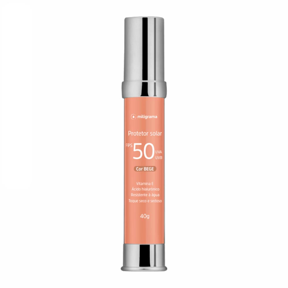 - Protetor solar com FPS 50 na cor Bege, formulado para proteger a pele dos danos solares