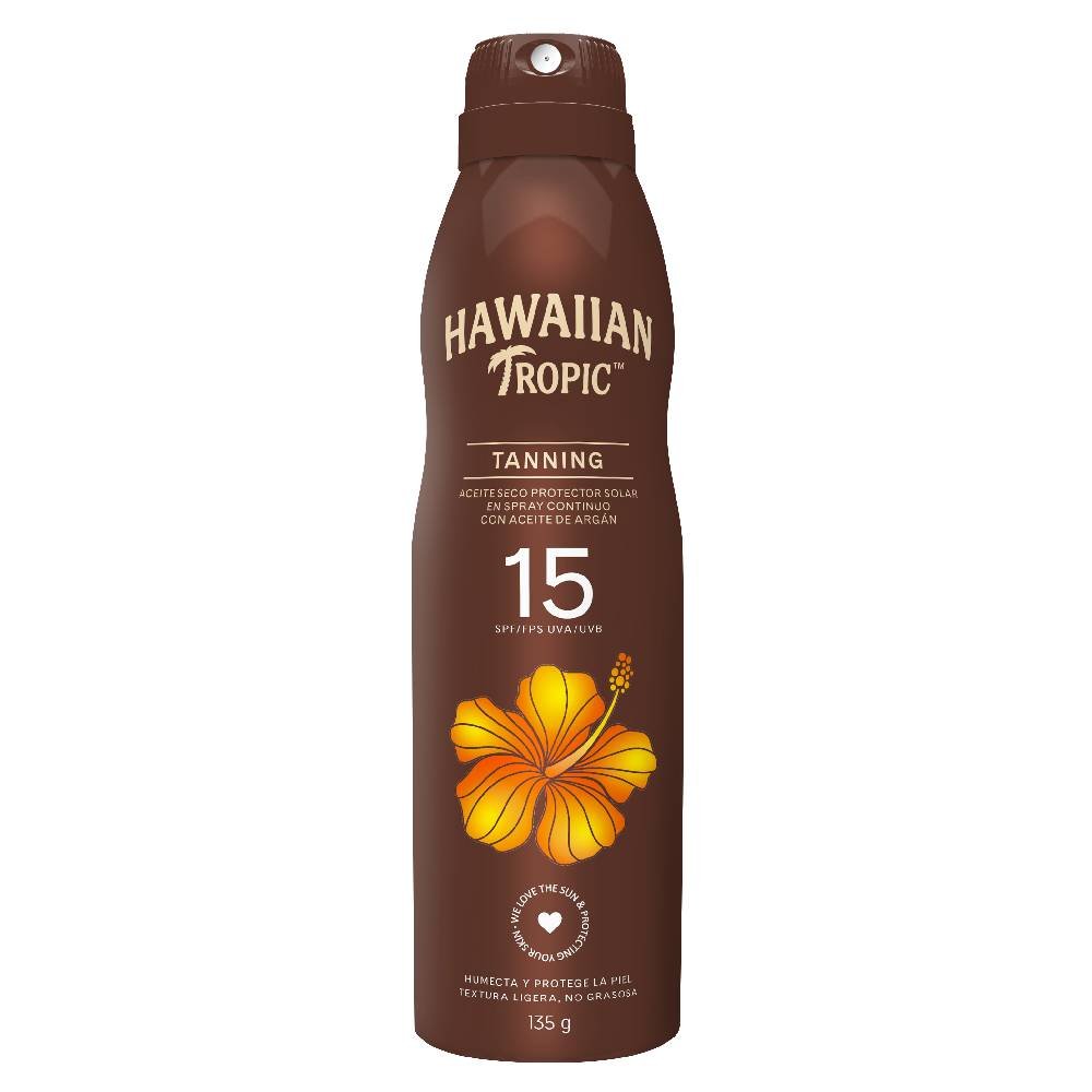 O Protetor Solar Corporal Aerosol Hawaiian Tropic Tanning FPS15 135g é um protetor solar em formato de spray, ideal para todos os tipos de pele. Sua fórmula leve e de toque seco contém óleo de argan, que ajuda a manter a pele hidratada e protegida, proporcionando um bronzeado natural com luminosidade.
