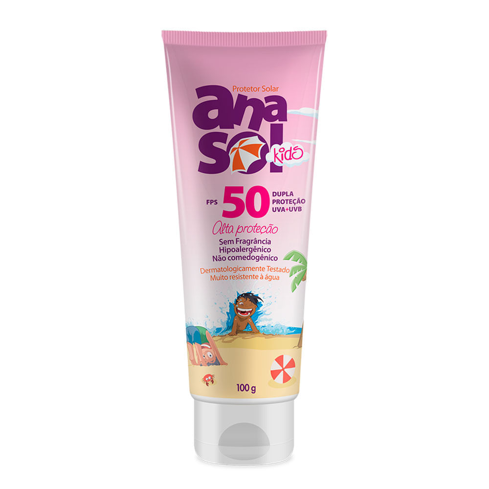 Anasol Protetor Solar Kids Fps 50:Produto hipoalergênico, formulado de maneira a minimizar possível surgimento de alergia, não comedogênico e dermatologicamente testado. Desenvolvido especialmente para crianças, aumenta a proteção da pele 50 vezes e é indicado para pele muito sensível a queimaduras solares.Oferece alta proteção. Ajuda a prevenir queimaduras solares causadas pelos raios UVB e envelhecimento precoce da pele causado pelos raios UVA. Contém proteção UVA equivalente a, no mínimo, 1/3 do FPS declarado (proteção UVB). Sua fórmula Oil free de toque seco, associada à ação hidratante da Aloe Vera e antioxidante da Vitamina E, não obstrui os poros, mantém a pele saudável.• FPS 50 – Dupla proteção UVA/UVB;• Alta concentração de filtro físico e sem fragrância;• Hidoalergênico e Dermatologicamente testado; • Muito resistente à água, por até 4 horas;• Hidrata enquanto protege, contém Aloe Vera; • Especialmente formulado para ser usado no corpo e no rosto de crianças e bebês acima de 6 meses de idade. Ativos: Tinosorb® S, Uvinul A Plus® e Dióxido de Titânio. Modo de Usar:Deve ser aplicado por adulto ou sob sua supervisão. Agite antes de usar. Aplique abundantemente antes da exposição ao sol. Muito resistente à água: Longa duração. É necessária a reaplicação do produto para manter a sua efetividade. Reaplique sempre após nadar ou banhar-se, secar-se com toalha, sudorese intensa ou após 2 horas de exposição ao sol. Se a quantidade aplicada não for adequada, o nível de proteção será significativamente reduzido. Não usar na pele irritada ou lesionada.