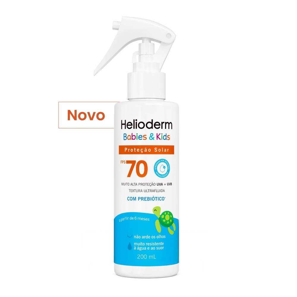 O Protetor Solar Helioderm Babies E Kids é um protetor infantil em spray com FPS70, de fórmula dermocosmética aprovada por pediatras. Enriquecido com prebióticos, ajuda a proteger a barreira cutânea do ressecamento. Tem textura ultrafluida, toque seco e rápida absorção, podendo ser usado diariamente no corpo e no rosto de crianças a partir de 6 meses.