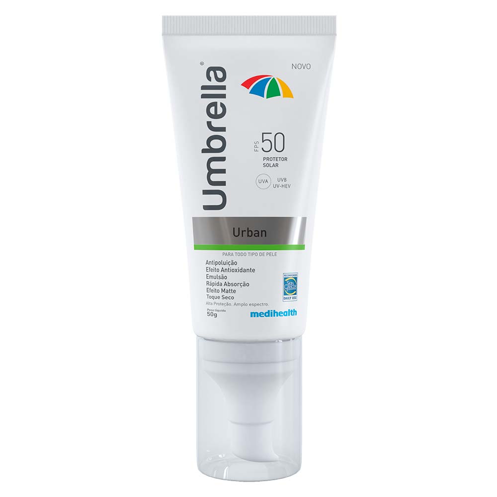 Umbrella Urban é um protetor solar com proteção alta para usuários com a rotina diária da vida moderna, que geralmente estão nos centros urbanos ou em locais com alto índice de poluição atmosférica e a preocupação vai além da proteção contra a radiação solar, como a proteção contra a poluição. Formulado com a A tecnologia Symurban proporciona proteção cutânea direta contra efeitos maléficos da poluição atmosférica (incluindo fumaça de cigarro), pois ela se liga com as partículas de poluição atmosférica impedindo que migrem para o núcleo celular e lá ativem os efeitos maléficos para a pele, como inflamação, envelhecimento cutâneo, entre outros.Modo de Uso: ?Aplicar abundantemente nas áreas que serão expostas à luz solar, no mínimo 20 minutos antes da exposição ao sol e/ou sempre que necessário. Reaplicar a cada 2 horas e após sudorese intensa, nadar ou banhar-se, secar-se com toalha e durante a exposição ao sol.Propriedades Adicionais: Textura oil-free ultraleve e invisível, efeito matte, toque seco, rápida absorção;Hipoalergênico;Não comedogênico;Não fototóxico;Dermatologicamente testado;Sem fragrância;Sem parabeno;Sem corante;Sem álcool etílico