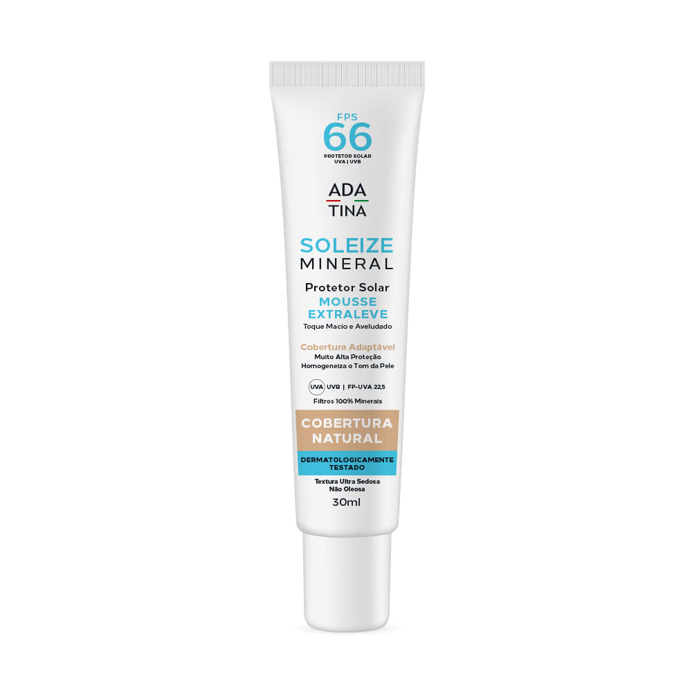 Soleize Mineral FPS 66 com cor adaptável para os fototipos cutâneos I, II, III e IV, ideal para quem procura um protetor solar de barreira física, com cor e alta proteção contra raios solares e luz azul e visível, perfeito para todos os tipos de pele, inclusive peles delicadas, sendo ideal para complementar o tratamento contra manchas escuras e melasma, com textura mousse extra leve e toque macio, aveludado e matificante.