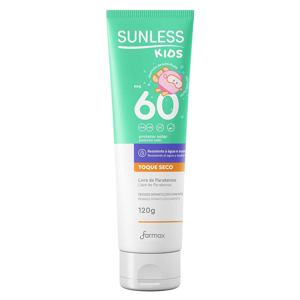 O Protetor Solar Kids FPS 60 Sunless 120g possui uma fórmula delicada, que protege a pele da criança contra a ação nociva dos raios solares UVA e UVB com alta eficácia.