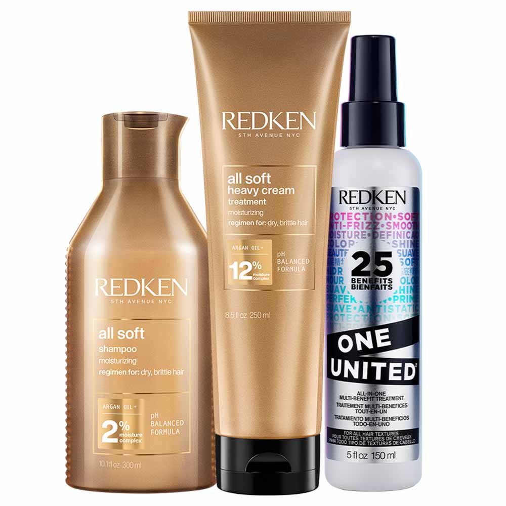 Descubra o poder transformador do Redken Kit - Spray de Tratamento One United + Shampoo Hidratante All Soft + Máscara de Hidratação Heavy Cream, um verdadeiro tratamento de luxo para cabelos quebradiços, secos e ressecados.