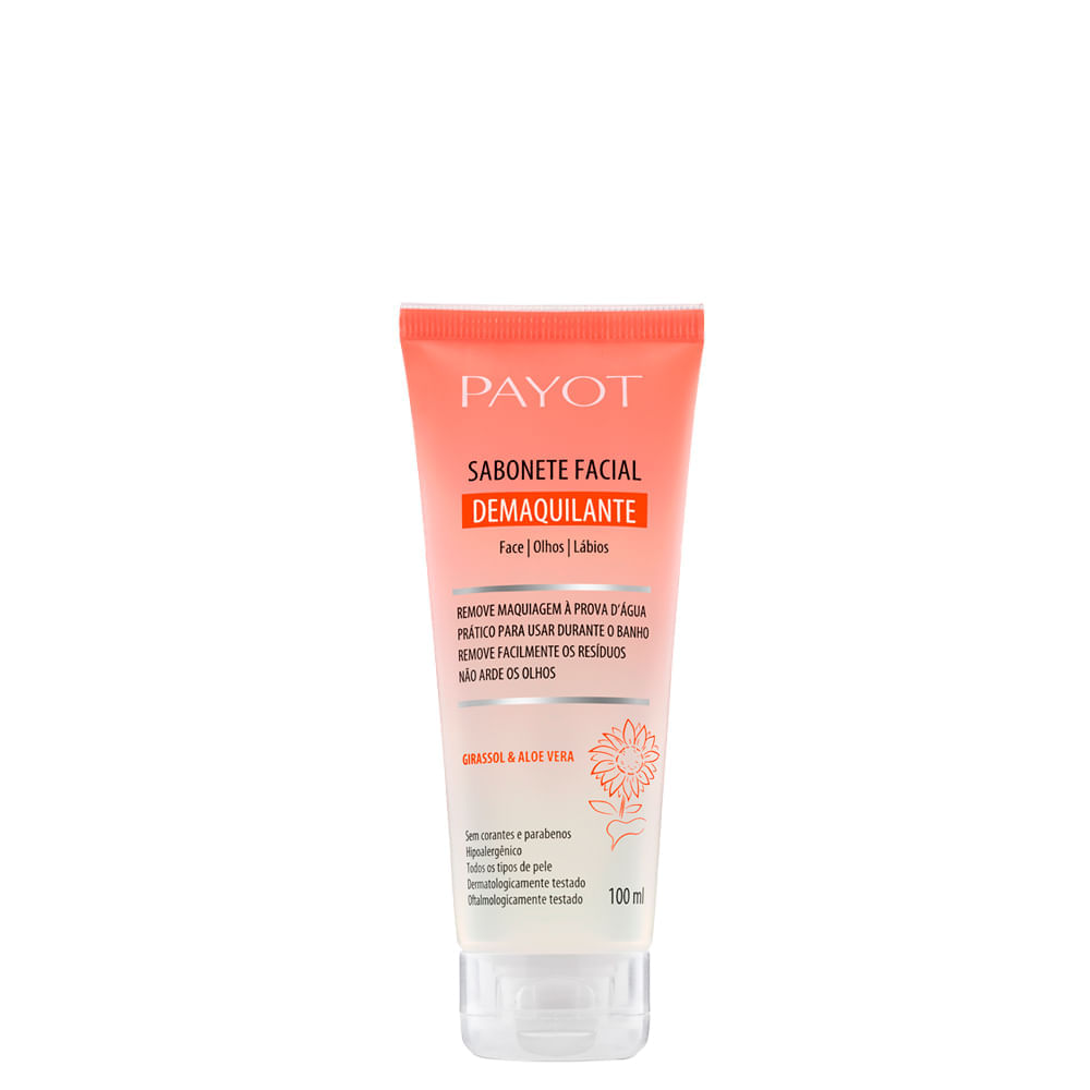 O produto é o Sabonete Facial Demaquilante Payot, que remove facilmente a maquiagem dos olhos, rosto e lábios.