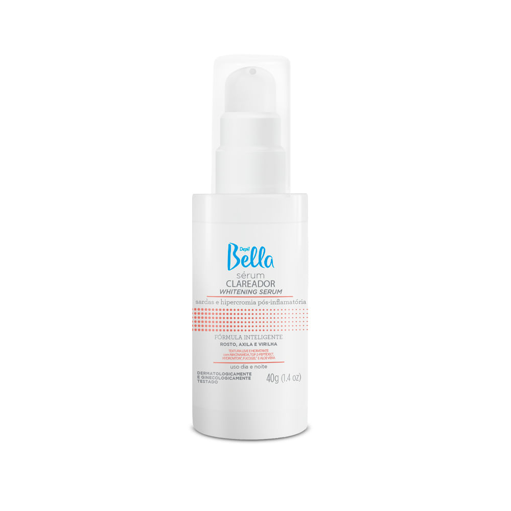 O Sérum Depil Bella Clareador 40g com nova fórmula traz em sua composição ativos com tecnologia de clareamento inteligente, capazes de agir sobre a hipercromia pós-inflamatória, de forma contínua e segura.