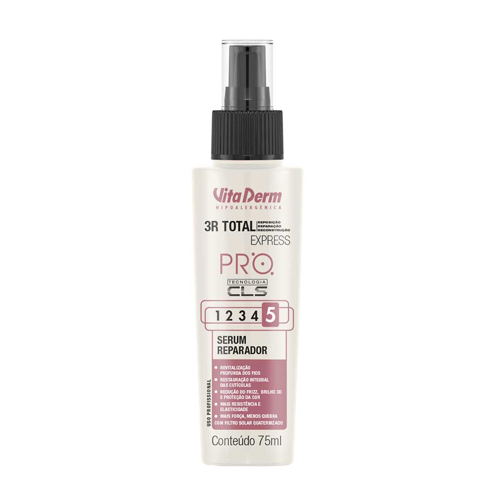 Sérum Reparador 3R Total Express Vita Derm, age na reposição da camada lipídica dos fios garantindo cabelos mais hidratados e sem frizz. Ação ultra hidratante, brilho intenso, proporciona maciez, Flexibilidade, desembarace os fios. Principais Ativos: Silicones reparadores, manteiga de karité, sericina, tamariliz, queratina, silicones reparadores, tecnologia cls (luna matrix system), e filtro solar quaternizado.Modo de uso:Aplicar algumas gotas do Sérum Reparador 3R Total Express na palma da mão, espalhe e aplique no comprimento e pontas.Linha 3R total express Vitaderm Hipoalergenica entrega o que promete em seus produtos.Sobre a marca:A Vitaderm é pioneira, no Brasil, em pesquisa e produção de biocosméticos, de tratamento para pele e cabelo. Fundada em 1984, pelo Dr. Marcelo Schulman, a marca, já com 37 anos, carrega em seu DNA a busca constante por inovação, tecnologia de ponta e, principalmente, respeito ao consumidor, aos parceiros e ao meio ambiente.Somos uma empresa de cosméticos brasileira referência no mercado de beleza e estética. Os produtos incríveis da Vitaderm são dermatologicamente testados pela Bioengenharia Cutânea, proporcionam resultados altamente eficazes e duradouros. A fabricação de cosméticos com princípios ativos de última geração e qualidade comprovada atende as necessidades dos profissionais e clientes, levando mais beleza e saúde a cabelos, pele e corpo. A essência da marca Vitaderm reforça sua atenção e seus cuidados especiais com os profissionais e clientes finais que utilizam sistematicamente seus produtos.