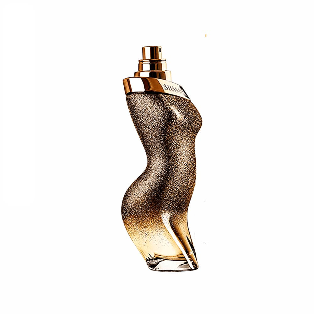 - Design do frasco inspirado nas curvas e movimento de Shakira, com brilhos dourados e pretos