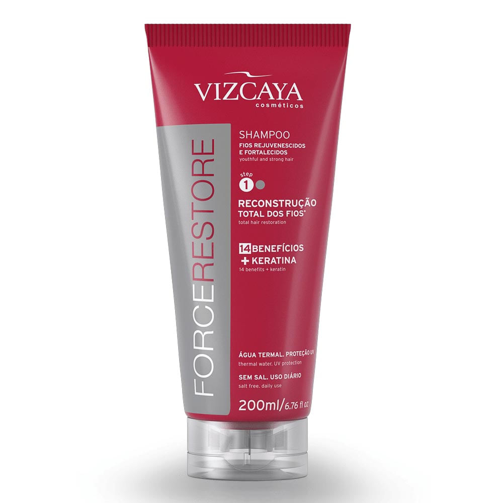Shampoo para cabelos danificados e com aspecto envelhecido. Vizcaya Force Restore Shampoo ajuda a reconstruir e fortalecer os fios, além de devolver a aparência jovem ao cabelo, com brilho e maciez.