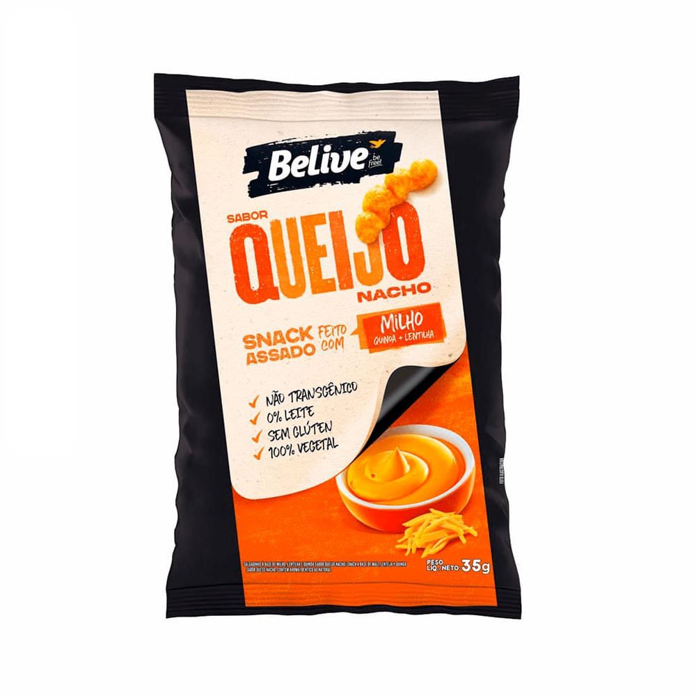 O Snack de Milho sabor Queijo Nacho, da Belive, é um salgadinho assado elaborado com quinoa, lentilha, farinha de arroz e farinha de soja integral (soja não transgênica), ingredientes naturais ricos em nutrientes, tais como carboidratos, proteínas, gorduras boas, vitaminas e minerais.