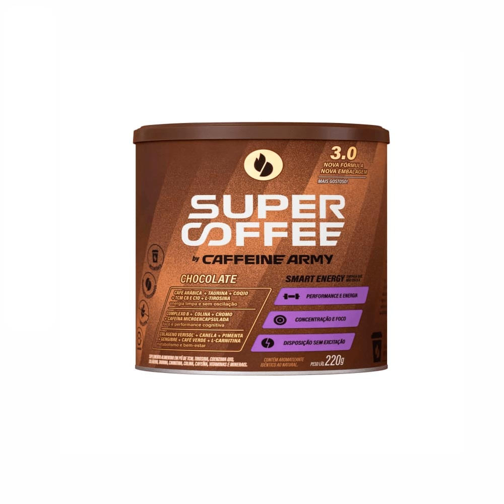 O SuperCoffee 3.0 sabor chocolate, da Caffeine Army, é um blend de ingredientes naturais exclusivamente combinados para proporcionar um boost de energia para o corpo e a mente.