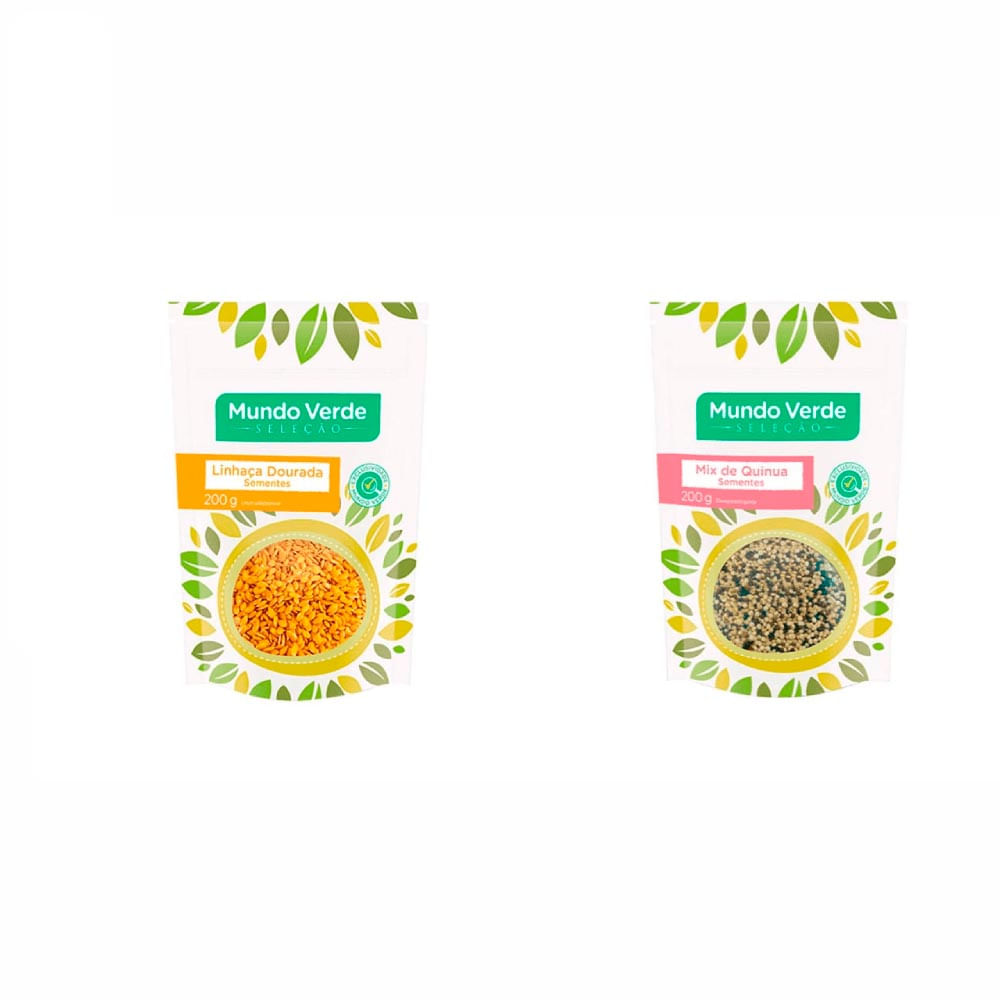 A Semente de Linhaça Dourada Mundo Verde Seleção 200g, é 100% natural, fonte de fibras, lignanas e ômega 3 e o Mix de Quinua em Sementes Mundo Verde Seleção 200g é composto por quinua vermelhas, brancas e pretas. Naturalmente sem glúten, contém fibras e aminoácidos.