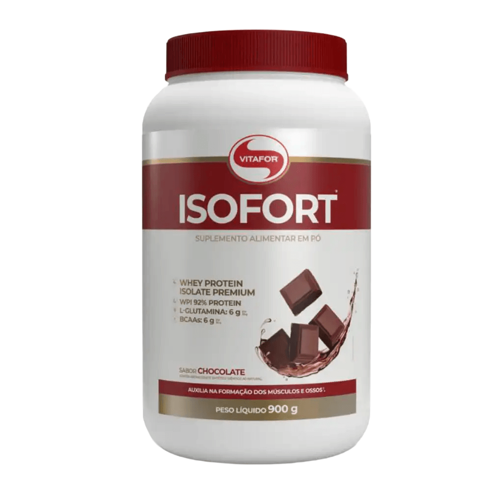 O Isofort Chocolate 900G da Vitafor é um suplemento proteico composto por 92% de whey protein isolado, fornecendo 26g de proteína por porção. Além disso, possui a adição de BCAA e glutamina. É um produto saboroso, cremoso, sem açúcar e sem glúten.