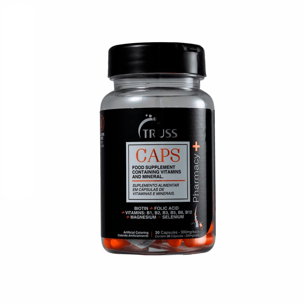 O complexo vitamínico Truss Pharmacy+ Caps auxilia no crescimento capilar, na prevenção da queda, fortalece os fios, hidrata internamente a fibra capilar e aumenta a resistência do cabelo e do brilho.