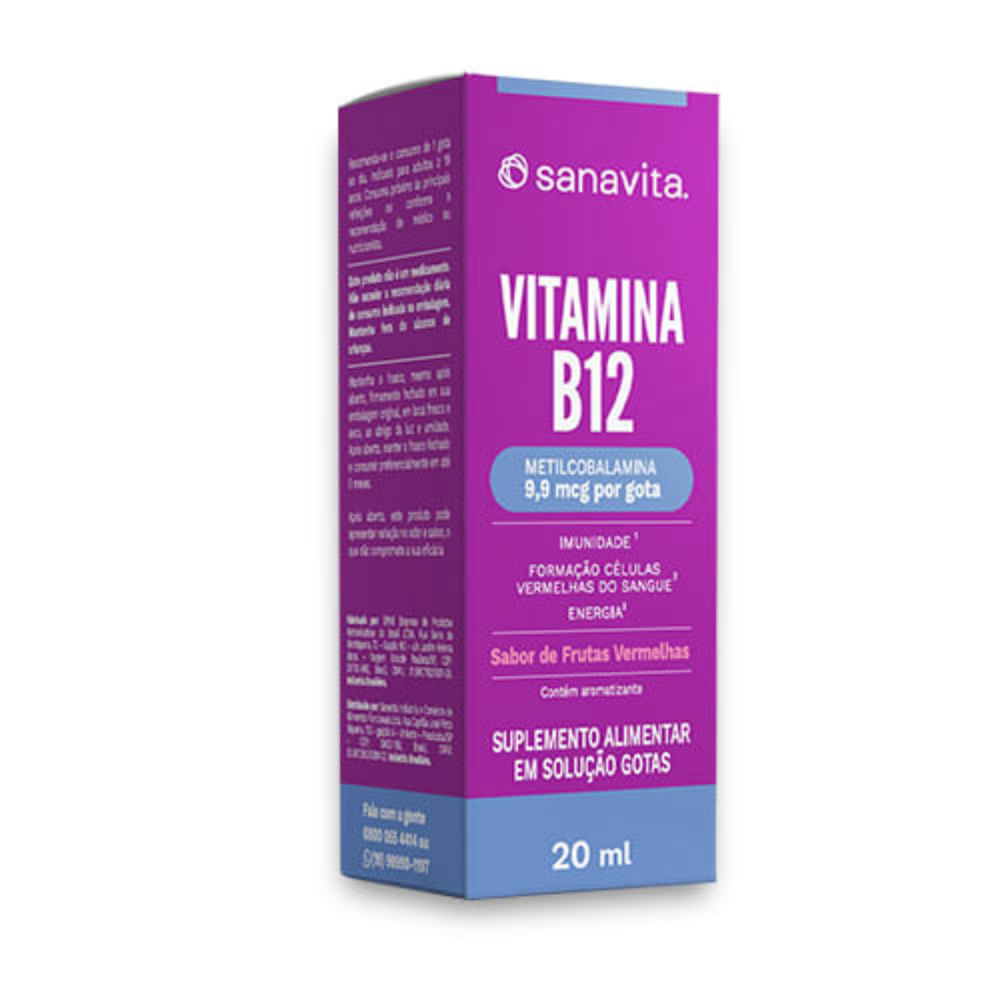 A Vitamina B12 da Sanavita é um suplemento nutricional que fornece vitamina B12 em uma fórmula de fácil consumo, com sabor de frutas vermelhas.