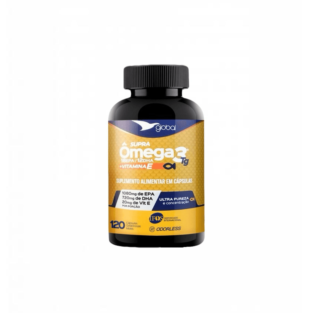 Supra Ômega 3 T.G- 1080mg EPA- 720mg DHA- Vitamina E-120 Cápsulas Ingredientes Óleo de Peixe e D-Alfa-Tocoferol. Cápsula: Água Purificada, Gelificante Gelatina INS 428 e Umectante Glicerina INS 422. Recomendação de uso conforme fabricante : Use diariamente 4 cápsulas do nosso Ômega 3 com Vitamina E Informações adicionais Acima de tudo para os Alérgicos: contém peixe. Pode conter leite e soja. Não contém glúten, mas cheio de EPA, DHA E VITAMINA E. Este produto não é um medicamento. Não exceder a recomendação diária de consumo indicada na embalagem.Manter fora do alcance de crianças. Produto dispensado de Registro conforme RDC 240/2018 Conservação Por fim o produto deve ser mantido bem fechado ao abrigo de luz, calor e umidade. Depois de aberto consumir preferencialmente em até 60 dias. Enfim não utilize se o lacre do produto estiver rompido.