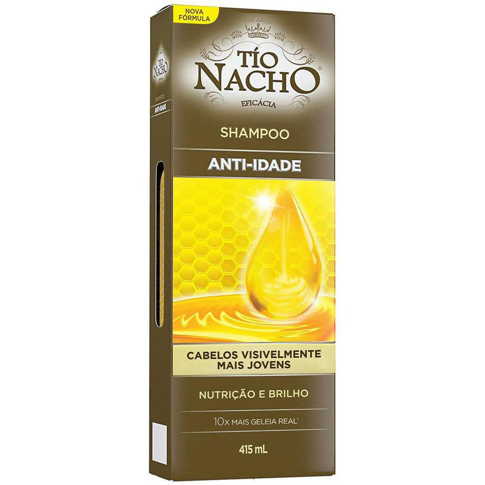 Tio Nacho Shampoo Antiqueda Anti-idade:Tio Nacho, traz uma fórmula exclusiva à base de Geleia Real combinada com extratos de origem natural para o melhor cuidado com os seus cabelos. São linhas de produtos especializados com resultados desde o primeiro uso para cabelos fortes, resistentes, hidratados e brilhantes.Tio Nacho tem uma linha completa ideal para o seu cabelo.O que é?Tio Nacho Anti-idade -solução antiqueda para os cabelos com propriedades que eliminam o excesso de oleosidade, hidratam e fortalezem os fios, oxigenando também o couro cabeludo. É rico em Vitamina E, um potente antioxidante. Proporciona brilho e suavidade.Para quem?Para cabelos frágeis e sem vidaComo usar? Aplique o Shampoo Tio Nacho Antiqueda Anti-idade sobre o cabelo molhado distribuindo generosamente, fazendo uma leve massagem no couro cabeludo. Enxágue.Para melhores resultados, repita a operação e use o Condicionador Tio Nacho Coco Antiqueda Anti-idade.ResultadosRestaura e devolve a aparência e o vigor de um cabelo jovem.