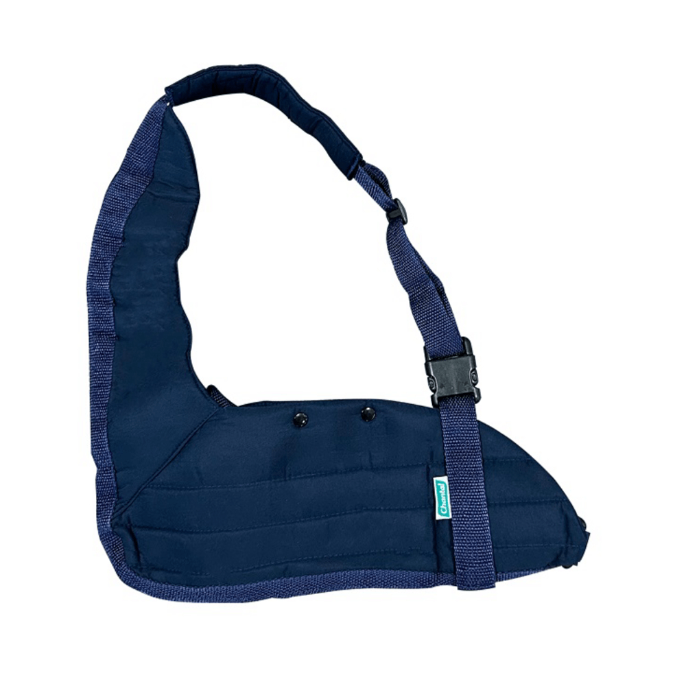 - TIPOIA IMOBILIZADORA ESTOFADA AZUL!!Indicações:Luxações recorrentes, instabilidades glenoumeral (articulação do ombro), bursites, tendinopatia, lesão labral, fratura do colo do úmero e luxações isoladas de cotoveloCaracterísticas:Confeccionada em tecido Poliéster dublado com espuma para promover conforto durante o uso.Desenvolvida para uso bilateral garantindo imobilização e estabilização do ombro esquerdo e direito de maneira precisa e eficiente. Possui alças e fivelas largas de material resistente que garantem um sistema de ajuste preciso e fechamento seguro para que o próprio usuário consiga executá-lo. Produto lavável.Instruções de colocação:1. Soltar as duas fivelas, pressione a trava central com o dedo polegar e indicador, puxando-as.2. Solte os botões de pressão (antebraço) e o fecho de contato localizado próximo ao punho.3. Coloque o braço na tipoia de forma que o cotovelo encaixe até o final.4. Pressione o botão de pressão e adere fecho de contato próximo do punho.5. Passe a alça pelas costas sobre ombro acomodando o protetor do pescoço no ombro contrário e trave a fivela.6. Contorne a alça próximo ao cotovelo na cintura e trave a fivela.7. Após a colocação, ajuste as duas alças da tipoia de forma com que o braço e o antebraço formem um ângulo igual ou menor 90°.