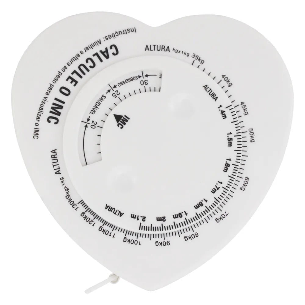 Disco para cálculo do Índice de Massa CorporalTrena com fita de fibra de vidro inelástica e maleável;Cálculo de IMC e referência de normalidade;Retração automática;Trava de fixação da fitaEscala: 0 a 150 cm - Resolução: 1 cmMedida visual de risco para DCV através de circunferência abdominalReferencia de risco para DCVInformação visual de lado masculino e lado feminino da fitaAs cores apresentadas no site são meramente ilustrativas e podem ou não corresponder com exatidão à tonalidade aplicada