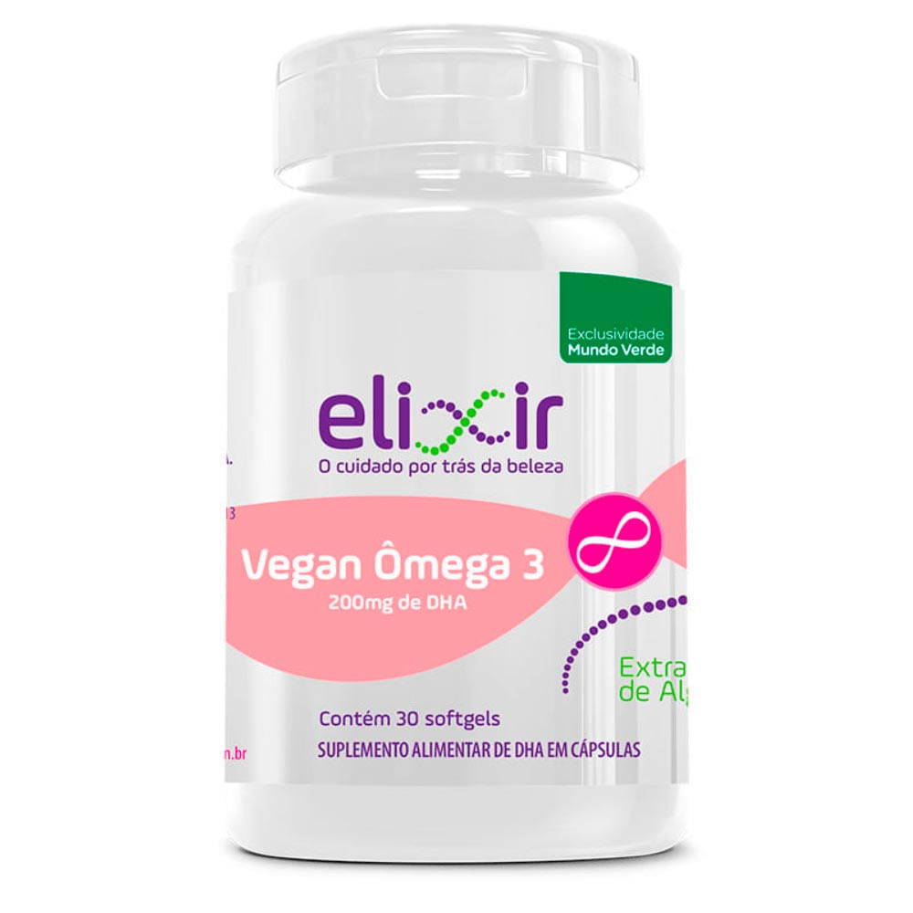 O Vegan Ômega 3,da Elixir é suplemento nutricional obtido através de algas, sendo uma opção de suplementação de DHA para vegetarianos e veganos. Contém 200mg de DHA na porção diária.