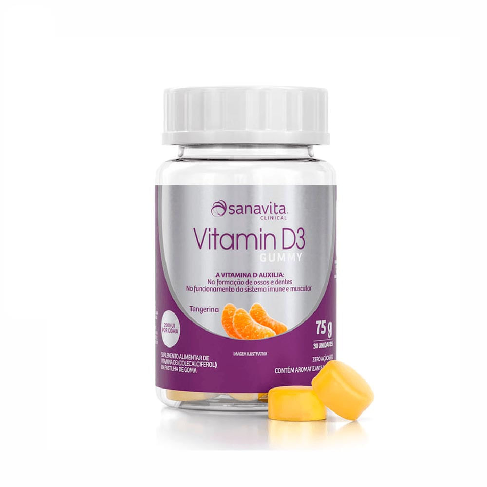 A Vitamin D3 Gummy, da Sanavita, é um suplemento alimentar que fornece 2000 UI (50 µg) de vitamina D3 em apenas uma unidade de goma sabor tangerina. Sua fórmula não possui adição de açúcares, é livre de glúten e aromas artificiais. Adoçada naturalmente com maltitol, sorbitol e estévia, colorida com cúrcuma, um corante natural e saudável.