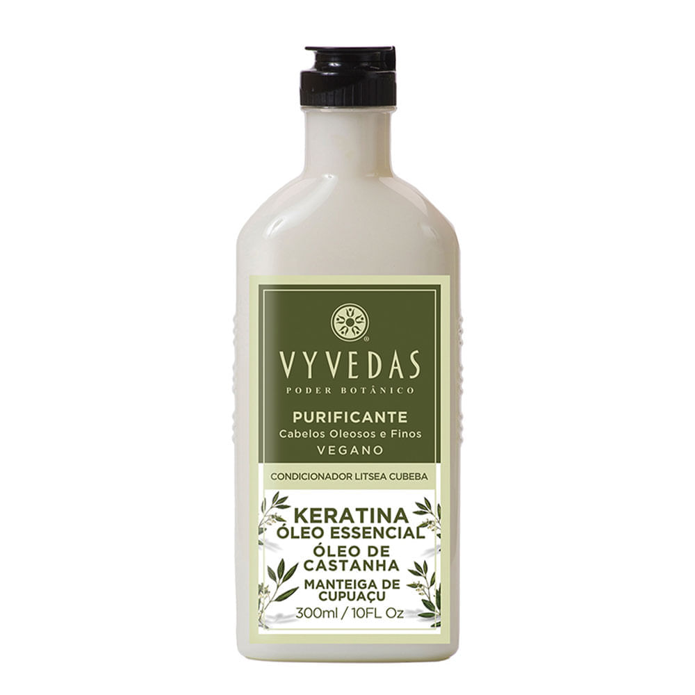 Condicionador Vyvedas Litsea Cubeba VeganoElaborado com o óleo essencial de litsea cubeba e a manteiga de cupuaçu, este maravilhoso condicionador desembaraça e amacia gentilmente seus cabelos, deixando-os leves e sedosos.O Condicionador Vyvedas Litsea Cubeba Vegano possui aroma cítrico, com ação bactericida, trazendo uma sensação de frescor e limpeza, emoliente, amacia e hidrata o cabelo.Pode ser usado em cabelos normais ou oleosos. Com aroma suave, é unissex. Produz uma deliciosa sensação refrescante.Totalmente livre de parabenos, trata gentilmente seus cabelos, deixando-os macios e sedosos.Ação: Óleo Essencial de Litsea Cubeba: planta típica da Ásia, seu óleo essencial é refrescante, revigorante e antidepressivo. Atua contra o estresse, cansaço e tensão nervosa. Tem propriedades antissépticas e purificantes. Possui delicioso perfume cítrico, um pouco mais suave do que o Capim-Limão.Manteiga de Cupuaçu: manteiga emoliente cremosa que promove uma hidratação duradoura, permitindo a recuperação dos cabelos e de sua elasticidade.Óleo de Castanha-do-Brasil: antirradicais livres e antioxidante, previne o ressecamento e hidrata os fios.Extrato de Alecrim: o nome do alecrim em inglês, rosemary, vem do latim rosmarinus, que significa orvalho do mar. O óleo é refrescante, estimulante. Também é excelente tônico para o couro cabeludo e para problemas como a queda dos cabelos e caspa. É excelente também para o controle da oleosidade.Como Usar: Após o enxágue do shampoo, aplicar o condicionador somente no comprimento e pontas dos fios, evitando a aplicação sobre o couro cabeludo. Deixe o produto agir por 2 a 3 minutos e enxágue bem, até que se elimine todo o resíduo.Nossos Experts Ensinam: Use o Condicionador Vyvedas Litsea Cubeba Vegano conforme o conselho de aplicação após lavar seus cabelos com o Shampoo Vyvedas Litsea Cubeba Vegano Pró Trigo e Queratina.Resultado: Promove alta hidratação, maciez, brilho e volume.